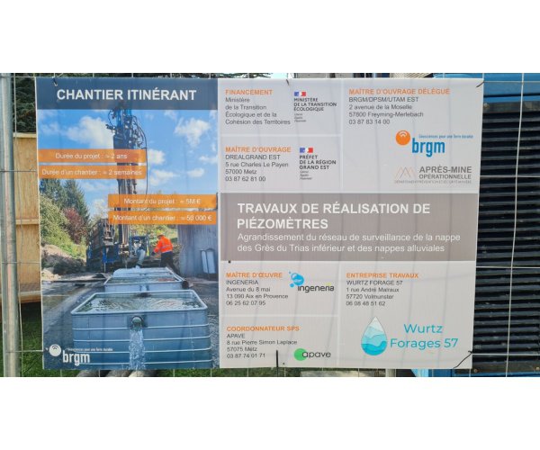 Le BRGM (Bureau de Recherches Géologiques et Minières) réalise actuellement des travaux de forage pour la création de deux nouveaux piézomètres, c'est-à-dire des points de surveillance des eaux souterraines. Ces installations permettront de mesurer régulièrement les niveaux de la nappe des GTi et de la nappe alluviale, dans le cadre du suivi de la remontée de la nappe des GTi.