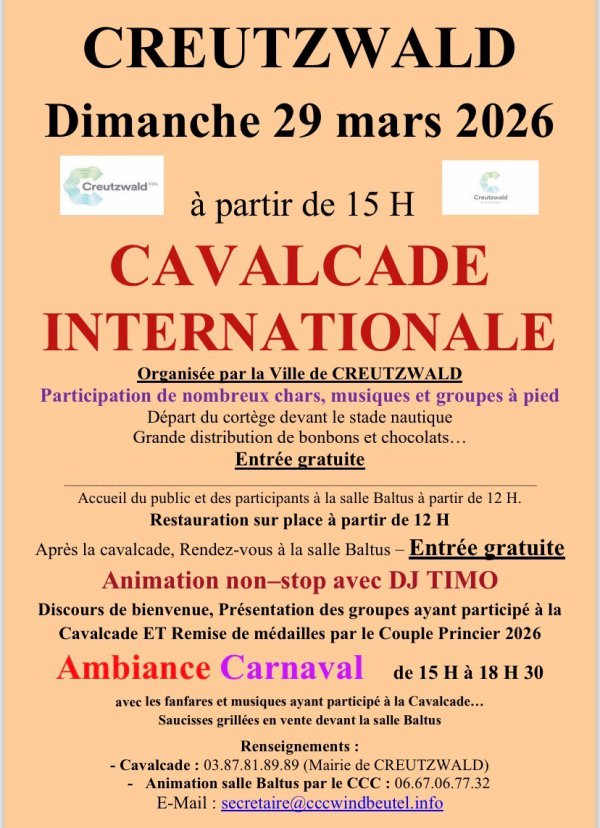 Le Syndicat d'Initiative, en partenariat avec la Ville de CREUTZWALD, organise le Dimanche 29 mars 2026 à partir de 15 H la cavalcade internationale.