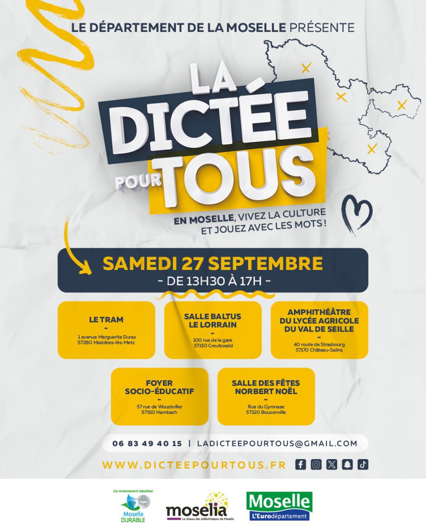 Le Département de la Moselle organise le Samedi 27 septembre 2025 de 13h30 à 17h à la salle Baltus : La Dictée pour tous afin de célébrer la langue française.