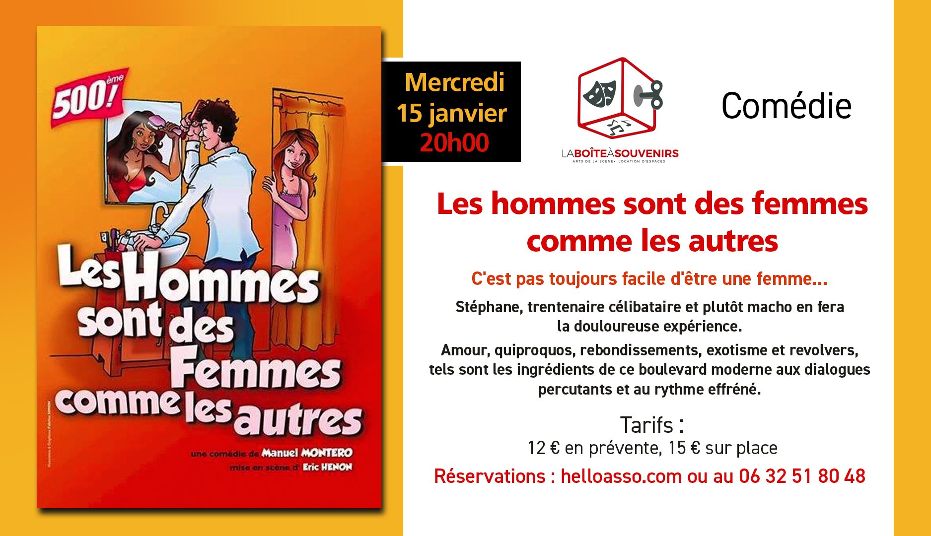 La Boîte à Souvenirs vous propose Mercredi 15 janvier à 20h une nouvelle comédie : "Les hommes sont des femmes comme les autres"