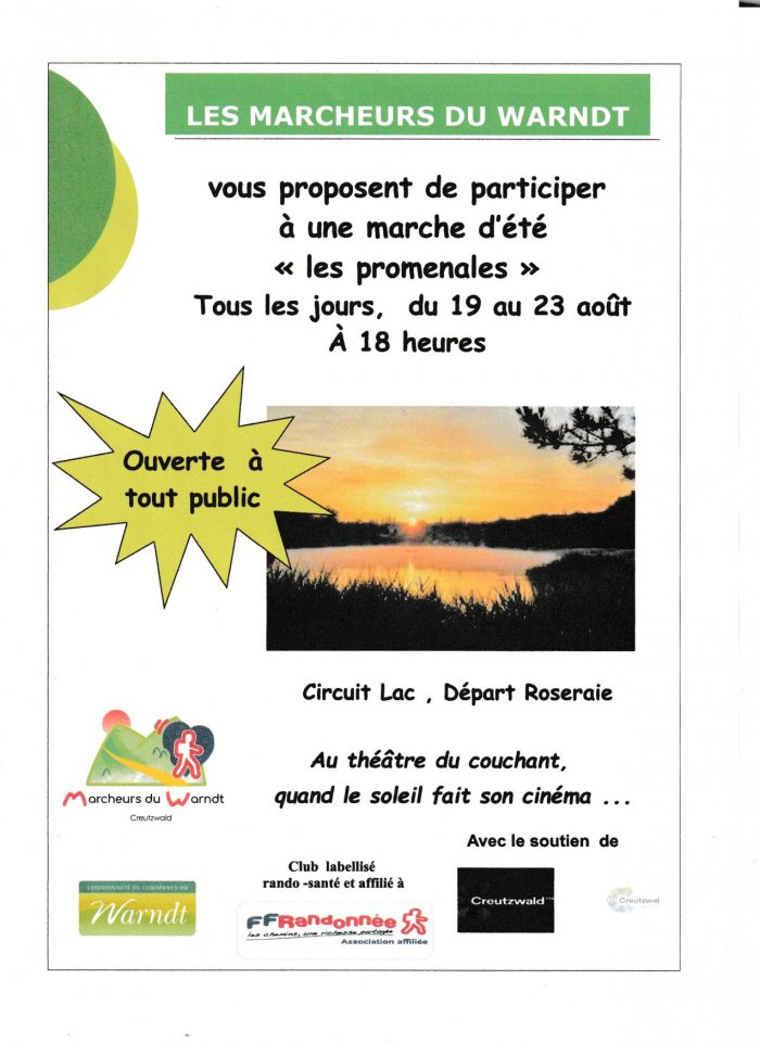 Marcheurs du Warndt : Les promenales19août23aoûtCatégorie(s)SportPartager : Marcheurs du Warndt : Les promenalesPartager par emailPartager sur TwitterPartager sur FacebookPartager sur LinkedIn
