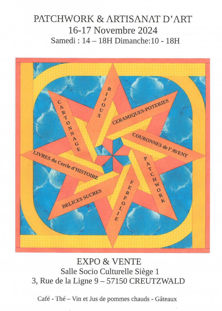 L'association Quilt et Patchwork organise une expo vente les 16 et 17 novembre 2024 à la salle socio-culturelle du siège 1.