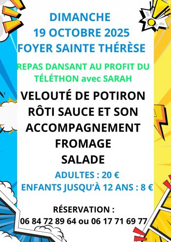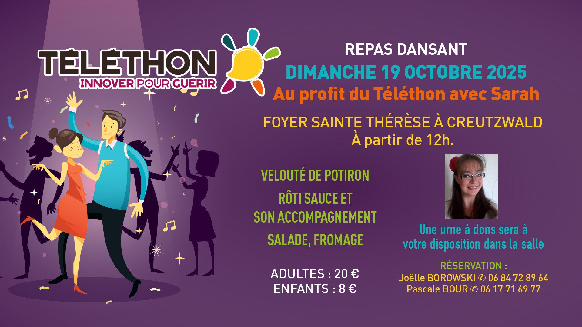L'association des Petits Petons organise un Repas dansant au profit du Téléthon dimanche 19 octobre à 12h au foyer Sainte Thérèse de Neuland avec Sarah.