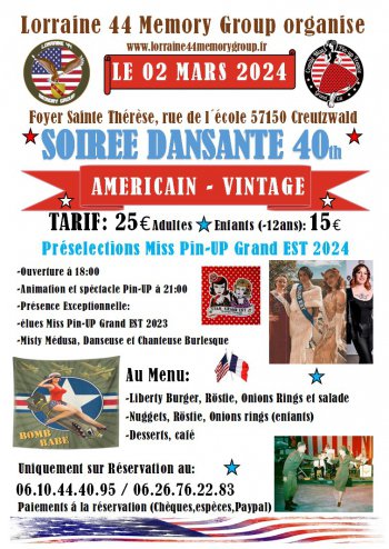 L'association Lorraine 44 Memory Group organise une soirée dansante 40th american vintage le samedi 2 mars 2024 à partir de 18h au Foyer Sainte Thérèse avec la preselection du concours Miss Pin-Up Grand Est 2024.