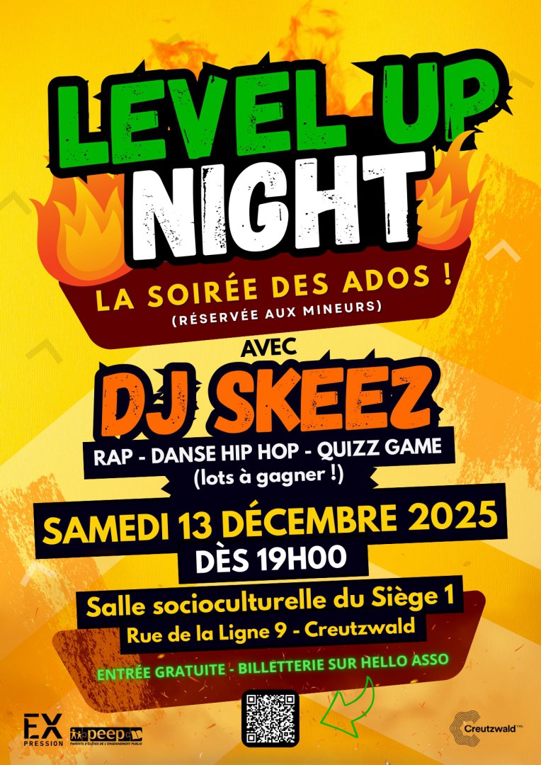 Soirée des ados « LEVEL UP NIGHT » le 13 décembre 2025 à partir de 19h00 à la salle du Siège 1 ;